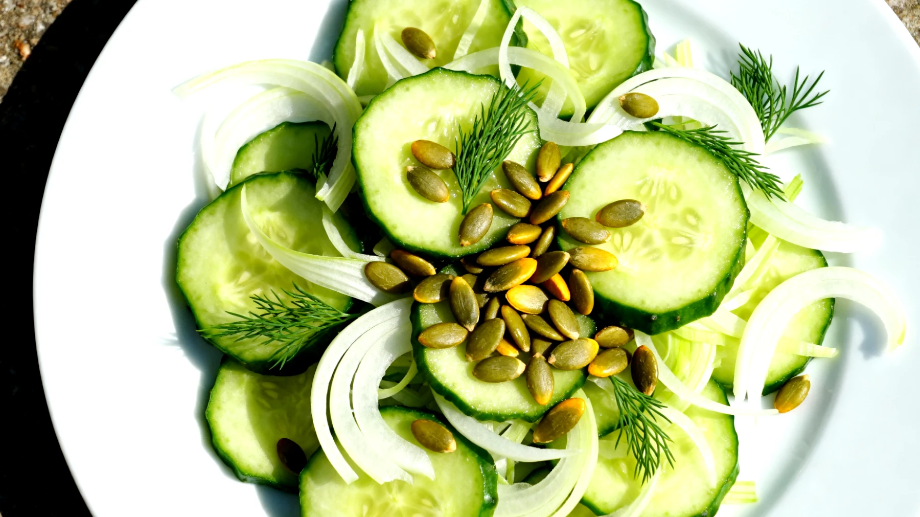 Die Zubereitung ist unkompliziert und dauert keine zehn Minuten. Eine Salatgurke und eine Fenchelknolle werden in dünne Scheiben geschnitten. Eine Handvoll Kürbiskerne lässt sich kurz in einer Pfanne ohne Öl rösten, bis sie duften und leicht bräunen. Alle Zutaten werden in einer Schüssel gemischt.