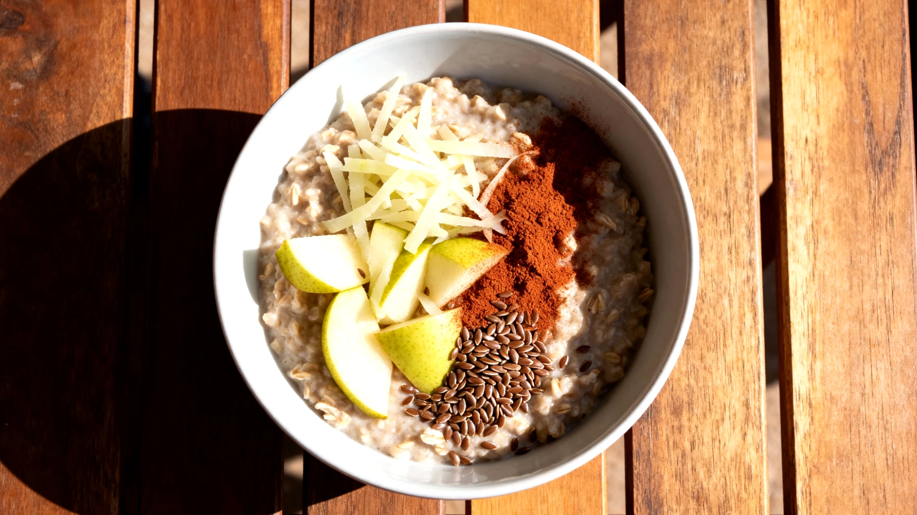Bei der Zubereitung gilt: Hafer mit ausreichend Flüssigkeit kochen, mindestens 200 Milliliter Wasser oder Pflanzendrink pro 50 Gramm Haferflocken. Die Leinsamen sollten erst kurz vor dem Verzehr geschrotet werden, idealerweise in einer Kaffeemühle oder einem Hochleistungsmixer. So bleiben die empfindlichen Omega-3-Fettsäuren geschützt. Die Birne wird mit einer feinen Reibe direkt über den Brei gerieben und untergerührt – zusammen mit dem Zimtpulver entsteht so eine cremige Konsistenz ohne zusätzlichen Zucker.
