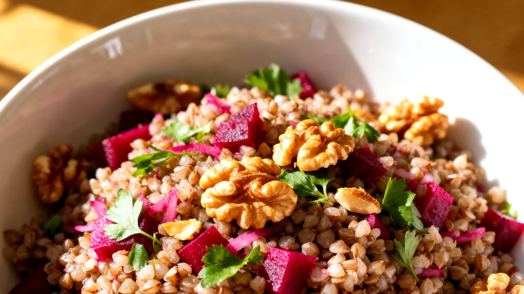 Die Grundzubereitung ist denkbar simpel: Buchweizen in der doppelten Menge Wasser etwa 15 Minuten köcheln lassen, bis er bissfest ist. Abkühlen lassen und mit gehackten fermentierten roten Rüben, grob zerkleinerten Walnüssen sowie frischen Kräutern vermengen. Ein Dressing aus Olivenöl, Zitronensaft, Knoblauch und einer Prise Kreuzkümmel rundet das Geschmacksprofil ab.
