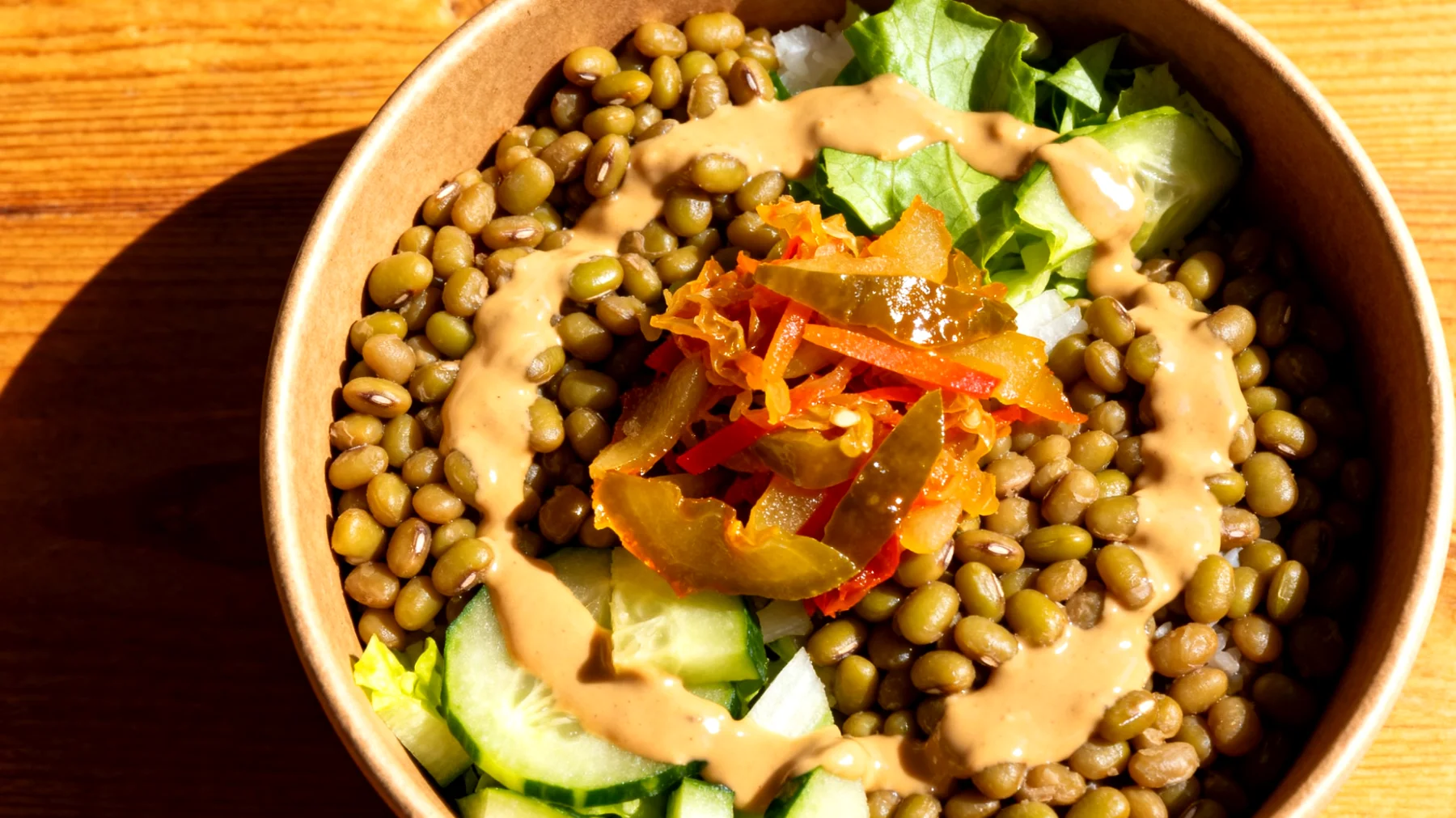 Die Basis bilden die gekochten Mungobohnen, die noch leicht bissfest sein sollten – nicht zu weich gekocht, da sie sonst matschig werden. Dazu kommt eine bunte Auswahl an rohem oder leicht gedünstetem Gemüse: