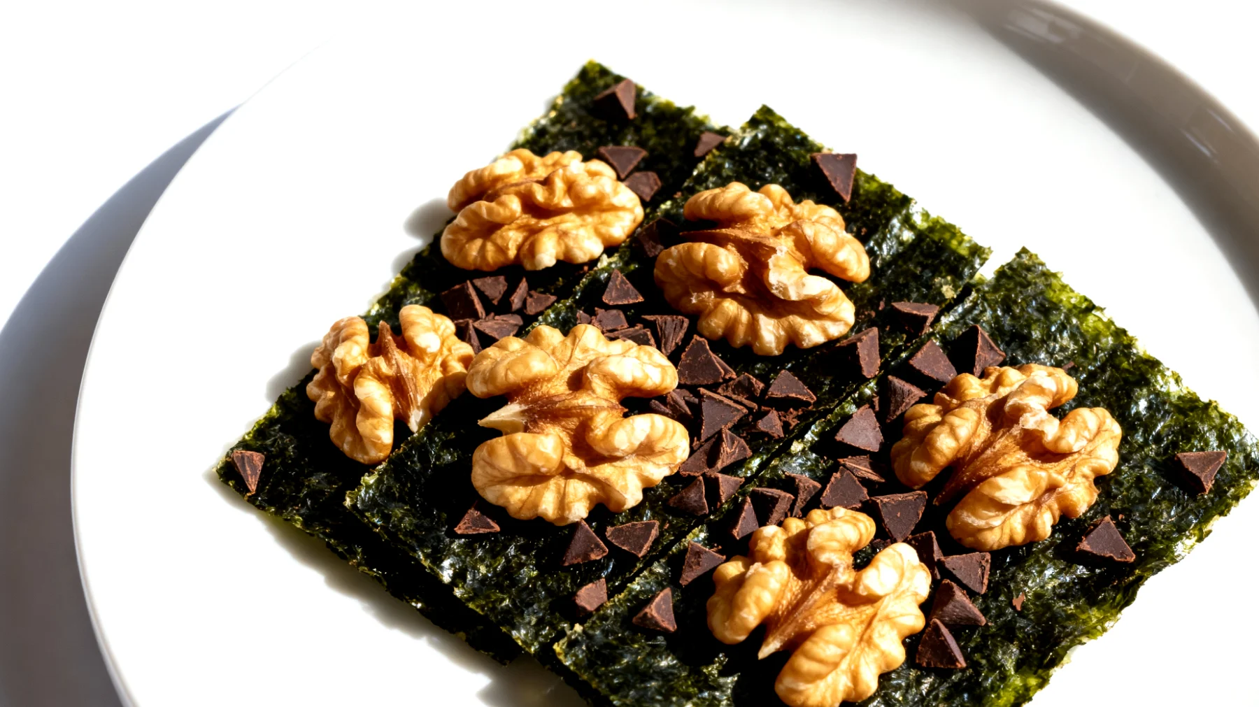 Wer Nori nur als Sushi-Hülle kennt, wird von der Kombination mit Walnüssen und Kakao überrascht sein. Die Algen bringen eine intensive Umami-Note mit, leicht salzig und an Meeresbrisen erinnernd. Walnüsse steuern erdige, leicht bittere Nuancen bei, während die Kakao-Nibs mit ihrer herben Schokoladen-Rohheit einen spannenden Kontrast setzen. Diese Aromenkomplexität macht den Snack nicht nur nährstoffreich, sondern auch sensorisch anspruchsvoll – weit entfernt von der Monotonie industrieller Riegel.